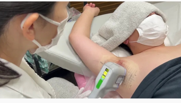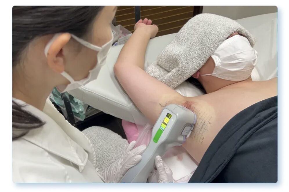 痛みを最小限にし、安全に治療を行うために脇に局所麻酔をします。注射のチクっとした痛みを感じる方が多いですが、その後の施術では痛みを感じない方がほとんどです。