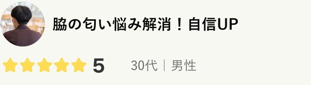 社会人になってから、緊張する場面で脇からニオイがするようになり、とても気になっていました。何度か周囲に指摘されることもあり、制汗剤で誤魔化していましたが、パートナーからも指摘されるように…思い切って施術を受けた結果、長年の悩みが完全に解決!人前で脇のニオイを心配する必要がなくなり、自信がつくようになりました。パートナーも「ニオイが全くしなくなった!」と驚いています。