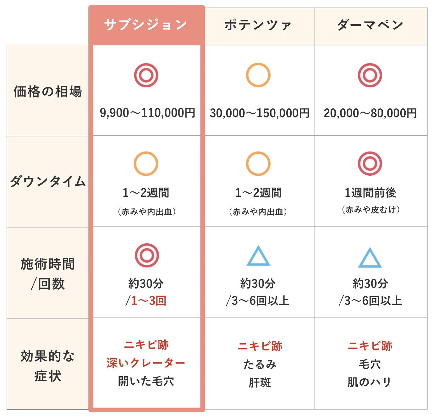 価格と 施術範囲 (税込) | ![]() 【期間限定】 \業界最安級!!/ 9,900円 (1cm×1cm) 55,000円 (頬orこめかみ) 110,000円 (全顔広範囲) | ![]() 55,000円 〜 110,000円 ー ー | ![]() 22,000円 (1cm×1cm) 55,000円 (5cm×5cm) ー |