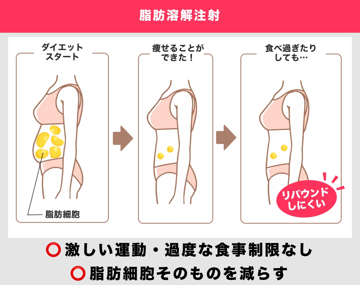従来のダイエットとは根本的に違い、脂肪細胞の数が減るため、理論上リバウンドしにくいとされています。