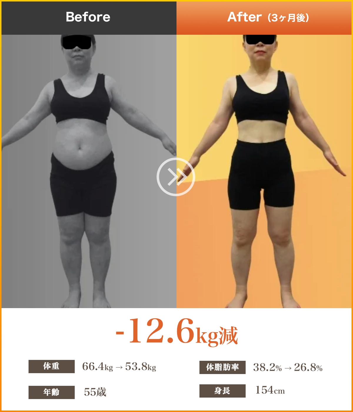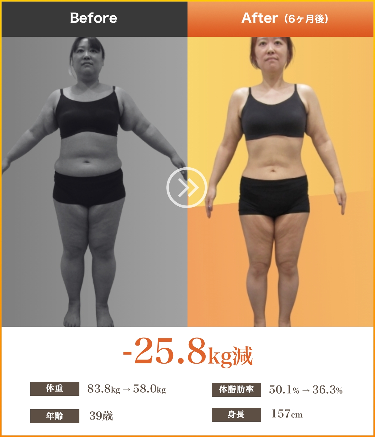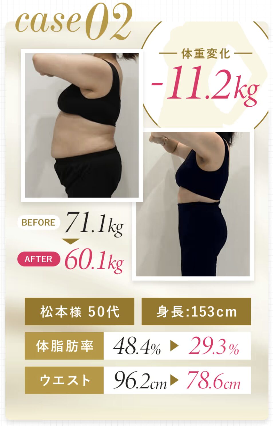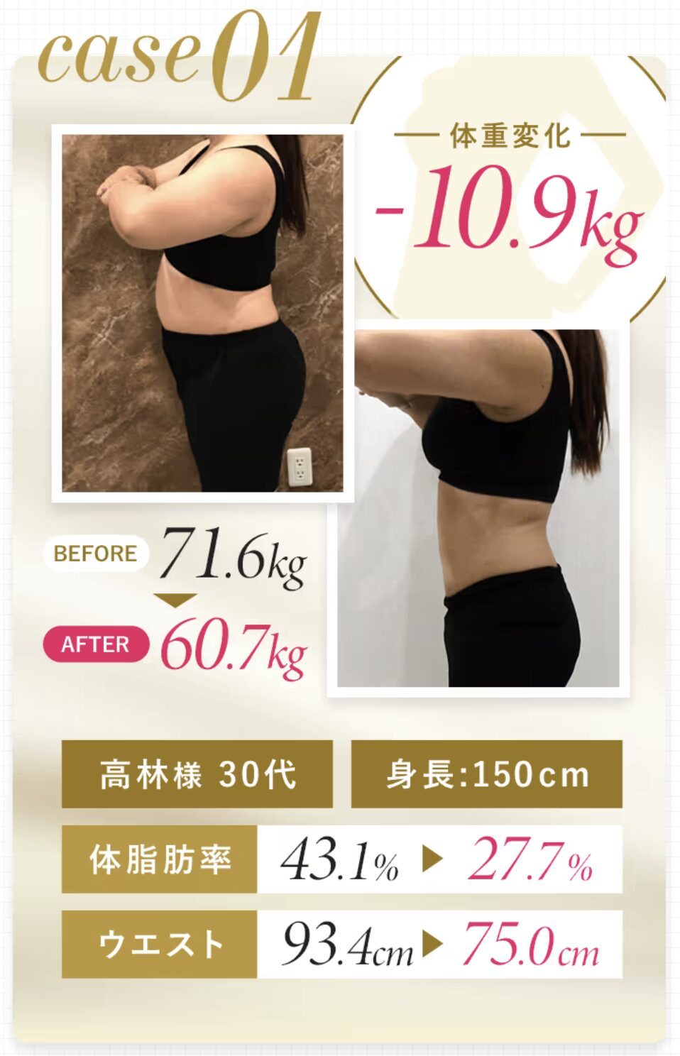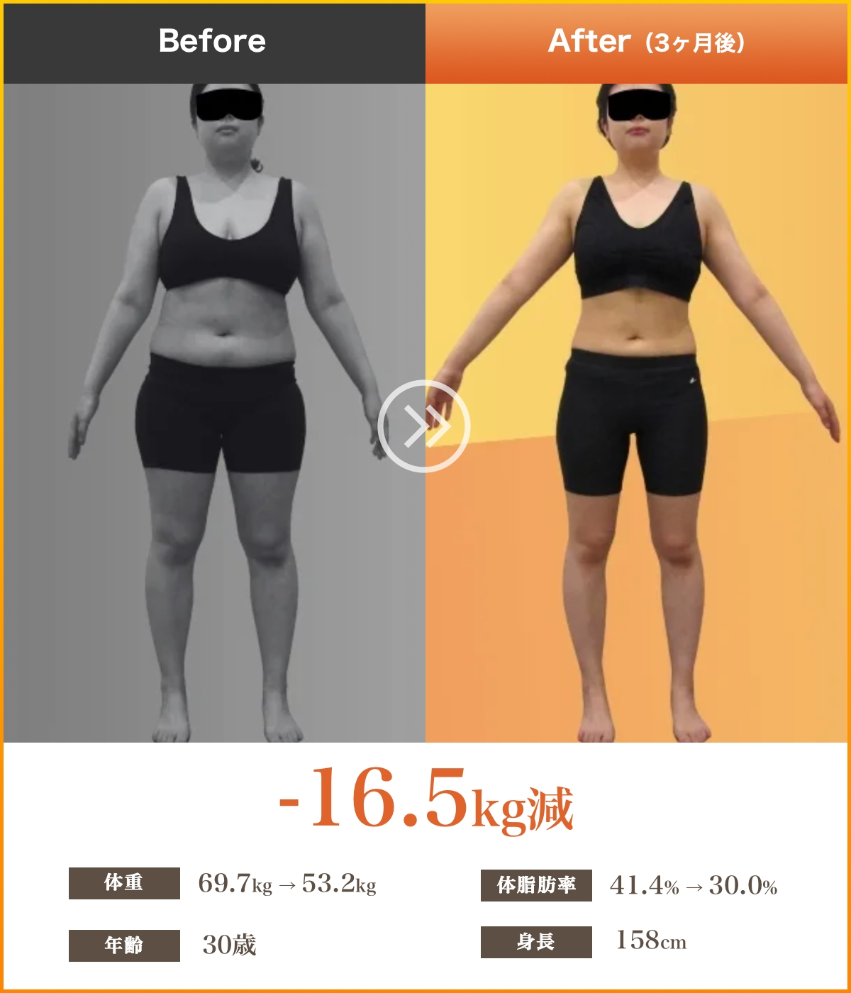 | 実績 | ![]() 3ヶ月で-16kg 1回で20%脂肪細胞減 | ![]() 3ヶ月で-9.2kg ー | ![]() 3ヶ月で-10.9kg ー |